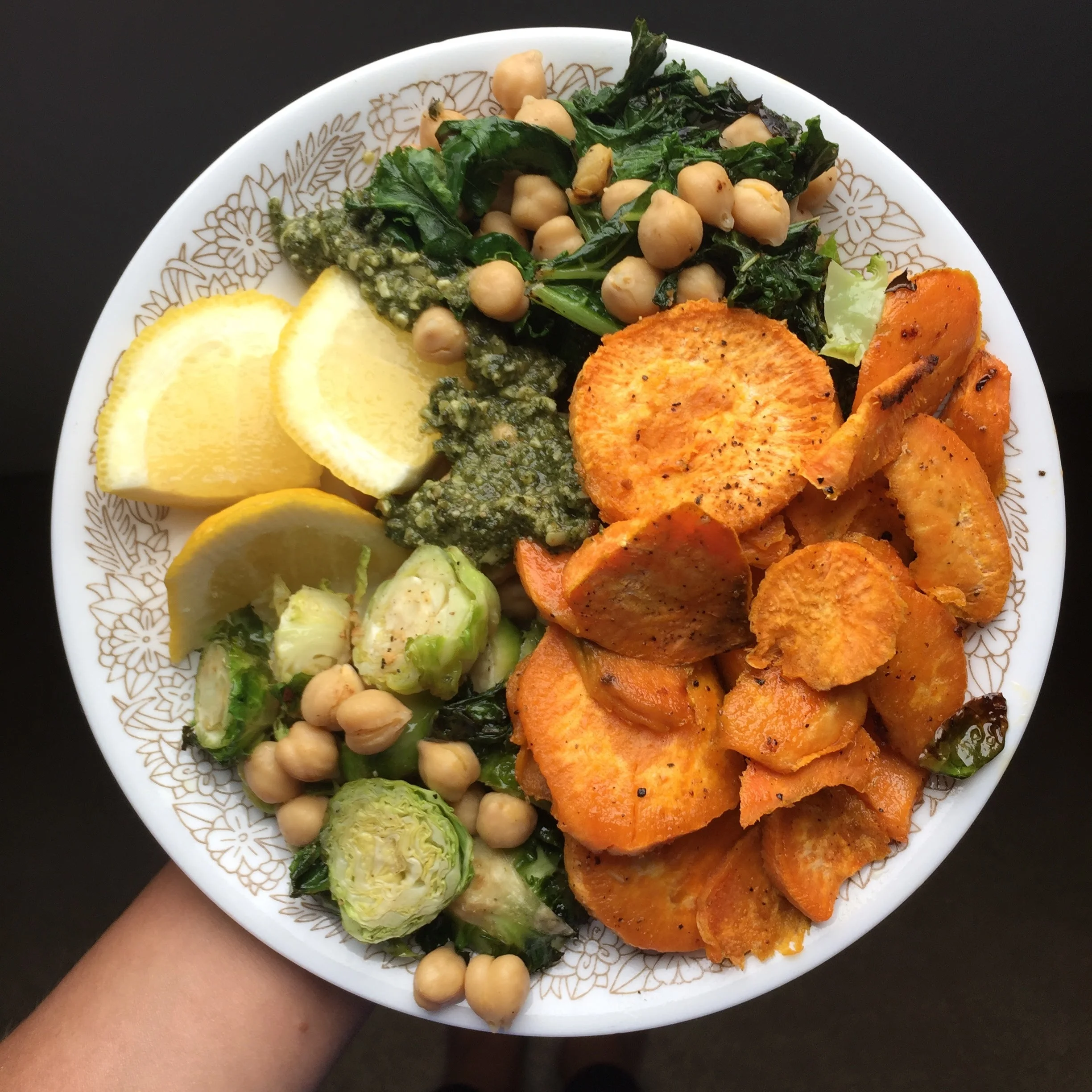 ONCE EVERYTHING IS COOKED, THROW EVERYTHING INTO A BOWL OR ON A PLATE AND ADD A SPOONFUL OF PESTO