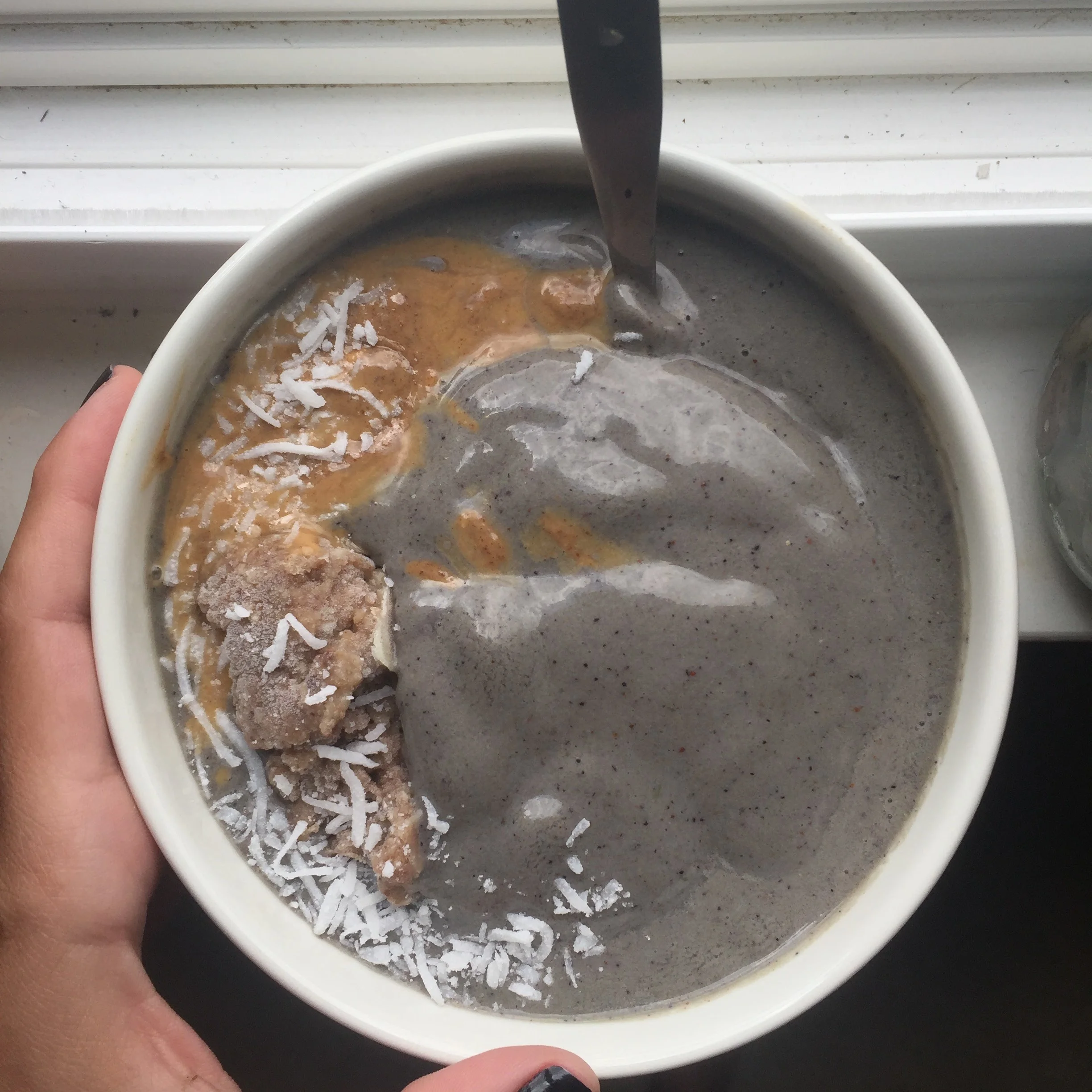 AFTER BLENDING I THROW ALL THE GOODS INTO A CUP OR BOWL AND TOP WITH A DOLLOP OF ALMOND BUTTER, A COCONUT BALL OR TWO AND SOME COCONUT FLAKES. I ALSO LIKE TO THROW FRESH FRUIT ON TOP WHEN I'M FEELING REALLY JAZZED ABOUT MY SMOOTHIE BOWL